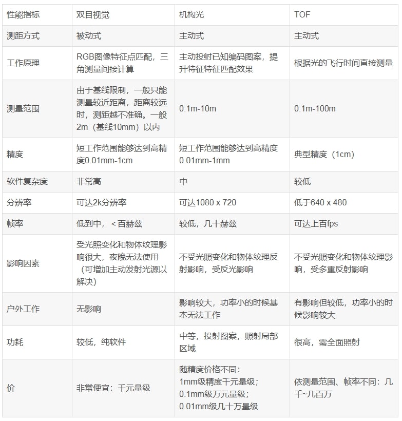 首页 动态 目前主流3D视觉技术各有什么优劣势?如何选择最Match的工业3D相机? 目前主流3D视觉技术各有什么优劣势?如何选择最Match的工业3D相机? 技术科普 2024-08-12 浏览量:1984 什么3D相机?3D相机与2D相机相比有什么差别? 3D相机,也被称作深度相机,与传统的2D相机相比,它能够多获取物体到相机的距离信息,即深度信息,结合2D图像的X和Y坐标,可以计算出每个点的三维坐标,从而实现三维重建、目标定位、导航避障等功能。 3D机器视觉可以完成许多2D机器视觉无法完成的任务。 以零件检测为例,下图零件表面有一划痕、边沿有凹陷。传统的2D机器视觉只能依靠表面图像颜色的不连续来判断是否缺陷,但此案例中,缺陷和零件表面反光颜色接近,判断难度很大,3D相机可以得到表面凹凸的深度信息,从而准确的判定划痕和边缘的凹陷。 此外,目前3D视觉技术在高精度检测、高精度测量(例如弯管、不规则件)、智能分栋、装配(引导机械臂在三维空间内避障和定位)、物流车导航等更多场景中实现了相较于2D机器视觉更为广泛的应用覆盖。 主流3D技术对比 3D相机的工作原理主要有三种技术:双目立体视觉、结构光和ToF(Time of Flight),还有其他市面上常见和新技术发展起来的相机种类。 1. 双目立体视觉基于视差原理并利用成像设备 从不同的位置获取被测物体的两幅图像,通过计算图像对应点间的位置偏差来获取物体三维几何信息。 一般立体视觉相机指的是被动式双目立体视觉相机,而主动式双目立体视觉相机是在双目立体视觉的基础上,增加了主动发射光源(通常是红外光)来辅助获取深度信息的相机系统,这种系统结合了被动双目视觉和主动发射光源的优势。 1. 被动式双目立体视觉相机 【优点】1)硬件要求低,功耗低,成本低。普通 CMOS 相机即可; 2)室内外都适用,尤其适合在户外工作; 3)适用于纹理丰富的场景。 【缺点】1)对环境光照非常敏感。光线变化导致图像偏差大,进而会导致匹配失败或精度低; 2)不适用单调缺乏纹理的场景。双目视觉根据视觉特征进行图像匹配,没有特征会导致匹配失败; 3)计算复杂度高。该方法是纯视觉的方法,对算法要求高,计算量较大; 4)基线限制了测量范围。测量范围和基线(两个摄像头间距)成正比,导致无法小型化。 2. 主动式双目立体视觉相机 通常是指在双目立体视觉的基础上,增加了主动发射光源(如红外光)来辅助获取深度信息的相机系统。这种系统结合了被动双目视觉和主动发射光源的优势。国内乐鱼leyu智能是研究该领域的专业企业。 【优点】1)低光场景可用:可在户外使用,同时也可在低光或无光环境工作,提高图像可见度和深度测量准确性; 2)增强纹理信息:为缺乏纹理的表面增加必要纹理信息,适合表面光滑和颜色单一场景; 3)降低环境光干扰:使用红外或特定波长的光源可以减少环境光变化对系统性能的影响。 【缺点】1)功耗增加:使用外部光源可能会增加系统的功耗,尤其是在需要长时间运行的应用中。 2)安装和校准:需要更精确的安装和校准过程,以确保光源和相机之间的正确对齐。 结构光 通过近红外激光器,将具有一定结构特征的光线投射到被拍摄物体上,再由专门的红外摄像头进行采集。这种具备一定结构的光线,会因被摄物体的不同深度区域,而采集不同的图像相位信息,然后通过运算单元将这种结构的变化换算成深度信息,以此来获得三维结构。 根据编码图案不同一般有:条纹结构光、编码结构光、散斑结构光。 【优点】1)方案成熟,相机基线可以做的比较小,方便小型化。 2)资源消耗较低,单帧 IR 图就可计算出深度图,功耗低。 3)主动光源,夜晚也可使用。 4)在一定范围内精度高,分辨率高,分辨率可达 1280x1024,帧率可达 60FPS。 【缺点】1)容易受环境光干扰,室外体验差。 2)随检测距离增加,精度会变差。 TOF 顾名思义是测量光飞行时间来取得距离,具体而言就是通过给目标连续发射激光脉冲,然后用传感器 接收从反射光线,通过探测光脉冲的飞行往返时间来得到确切的目标物距离。 因为光速激光,通过直接测光飞行时间实际不可行,一般通过检测通过一定手段调制后的光波的相位偏移来实现。 TOF 法根据调制方法的不同,一般可以分为两种:脉冲调制(Pulsed Modulation)和连续波调制 (Continuous Wave Modulation)。 脉冲调制需要非常高精度时钟进行测量,且需要发出高频高强度激光,目前大多采用检测相位偏移办法来实现 TOF 功能。简单来说就是,发出一道经过处理的光,碰到物体以后会反射回来,通过捕捉来回的时间计算距离。 【优点】 1)检测距离远:在激光能量够的情况下可达几十米。 2) 受环境光干扰较小。 【缺点】 1)对设备要求高,特别是时间测量模块; 2)资源消耗大。 该方案在检测相位偏移时需要多次采样积分,运算量大。 3)边缘精度低。 4)限于资源消耗和滤波,帧率和分辨率都没办法做到较高。 三种技术性能对比 上一个:【最全选型攻略】挑选合适的工业相机,必须提前考虑12要素! 返回列表 下一个:3D机器视觉可以完成许多2D机器视觉无法完成的任务。 更多新闻推荐 端到端 更易用丨乐鱼leyu®散料运输动态监测与预警系统全新上市 新品上市 2025-02-20 小尺寸 更灵活丨乐鱼leyu3D相机PEA020-800-Y80S上新,助力多场景智造升级 新品上市 2024-09-29 【最全选型攻略】挑选合适的工业相机,必须提前考虑12要素! 工业相机 2024-07-16 
