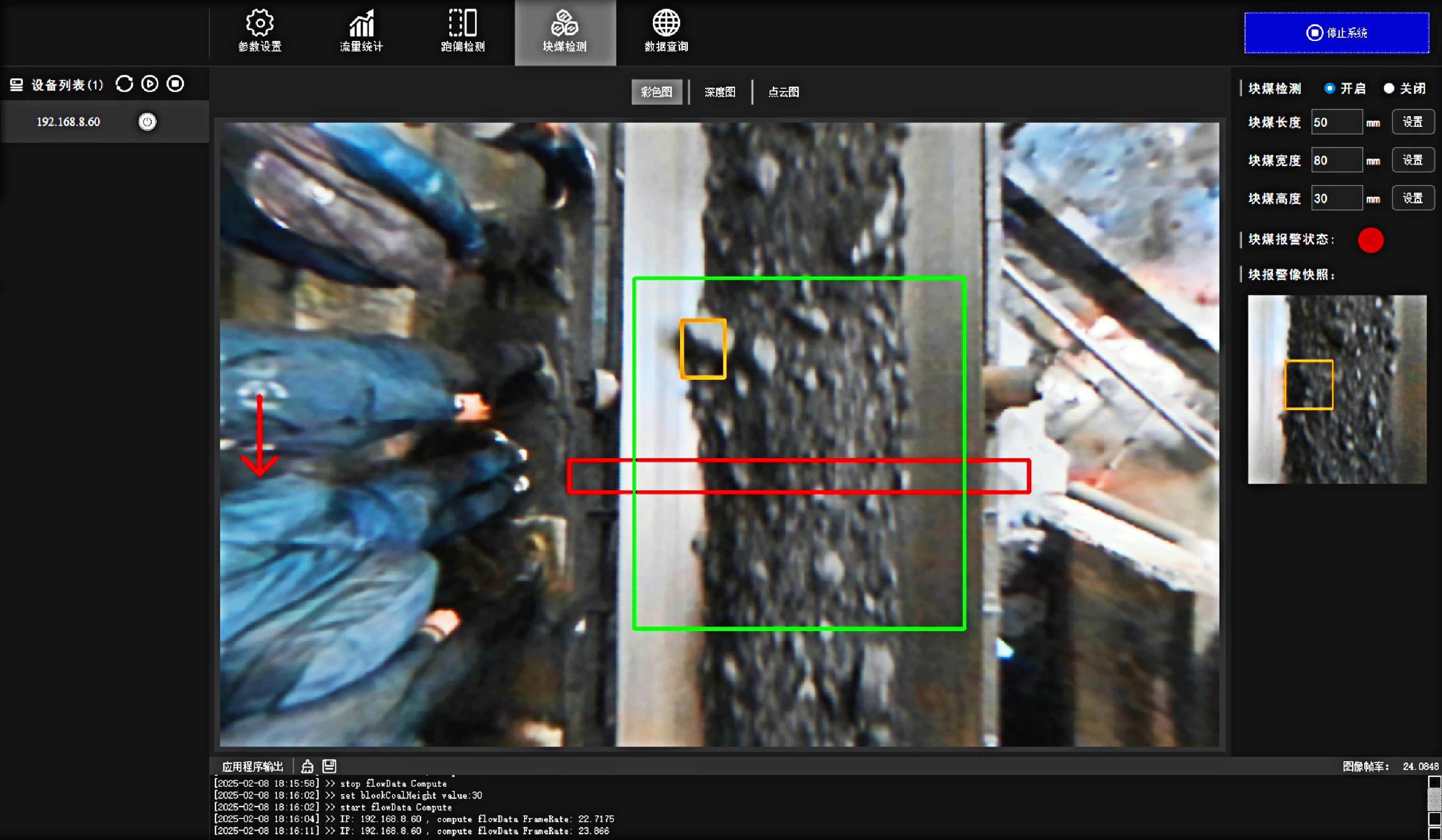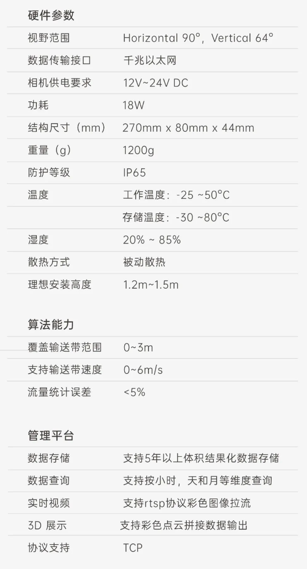 首页 动态 端到端 更易用丨乐鱼leyu®散料运输动态监测与预警系统全新上市 端到端 更易用丨乐鱼leyu®散料运输动态监测与预警系统全新上市 新品上市 2025-02-20 浏览量:164 在各类涉及散料运输的行业场景中,普遍面临着诸多棘手问题,严重影响生产效率、成本控制以及生产安全,作为具备端到端能力的 3D 视觉智能化解决方案专家,乐鱼leyu机器人公司正式推出软硬件一体化智能散料运输动态监测与预警系统,护航全场景散料运输,助力多行业生产效率提升。 方案介绍 乐鱼leyu®散料运输动态监测与预警系统 司眸® RGBD 智能相机 司眸®VAE020-800-X180是乐鱼leyu机器人公司最新自主研发的升级款 工业级RGBD感算一体式智能相机产品,基于双目散斑结构光感知技术,异构3D实时成像技术提供更精细的深度感知,在SLAM、三维重建技术加持下,提升点云数据精度和图像处理能力,升级的增强光学投射系统,缩短曝光时长,减少运动模糊,更适用于高速场景。 智能料流检测软件 乐鱼leyu公司智能料流检测软件,内置自研高精度料流测量算法,可全面监测输送带的运行速度、流量体积、堆料高度、块料大小、欠载状态、皮带跑偏等信息,实现输送带散货物流精细化监测。 监测管理平台 客户端软件支持实时视频查看、历史数据查询、实时人机交互控制。 系统功能 流量统计 司眸®VAE020-800-X180 RGBD 智能相机动态采集输送带上物料的三维数据,结合高精度流量体积测量算法,生成精准流量体积数据。 支持皮带速度:6m/s 数据查询:支持按小时、天和月等维度查询 自动测速 该方案能够自动测量输送带运动速度,确保及时发现异常,结合报警系统可防止设备故障或安全事故,同时实现料流精细化控制,优化输送调度,提升输送效率。 环境条件:需具备照明条件 覆盖输送带宽度:0 ~ 3m 块料检测 通过三维点云数据分析,能够识别自定义参数范围出现的块料,并突出标记,同时实时跟踪,并进行系统预警。 支持皮带速度:≤ 6m/s 块料参数自定义:支持 煤堆监测 实时监测料流高度,当发现料流高度过高可能导致物料堆积堵塞时,及时预警。 检测精度:毫米级 覆盖皮带宽度:0~3m 欠载检测 当检测到料流高度过低时,表明输送带此时处于欠载状态,系统可及时预警,消除生产安全隐患,提升生产效率。 检测精度:毫米级 覆盖输送带宽度:0~3m 跑偏检测 自主设定跑偏阈值,算法自动比较皮带实时偏移量和设定阈值,判断输送带是否偏离正常轨道,输出计算跑偏幅度和方向,显示具体数值,同时可及时发出警报。 检测精度:毫米级 覆盖输送带宽度:0~3m 核心优势 01 高精度测量,数据稳定输出 测量精度可达毫米级,测量结果与实际物料流量误差小于5%; 支持深度数据和RGB数据同步对齐输出; 02 超大景深,超宽视野 测量输送带宽度达3m; 测量堆料高度达1.5m; 03 部署简单,安装便捷 无需改变现场环境即可快速安装; 调试简单,系统易于维护; 04 端侧AI,架构简洁 数据传输延迟更低; 不需要额外工控机计算设备; 更省安装与维护成本; 05 一个平台,多个应用 单机实现散料皮带流量监控、堆煤、跑偏、测速等多种应用; 06 RGBD应用开发平台 司眸®RGBD智能相机可作为应用开发平台,持续衍生出更多闭环应用; 07 快速响应防爆需求 针对防爆需求,提供10mm厚度防爆玻璃解决方案,确保在防爆环境下正常使用而不影响3D成像效果; 方案能力 应用场景 Human+™乐鱼leyu®深耕机器视觉领域近十年,3D 视觉 AI 技术积累深厚,经过长期自主研发,现已推出A系列、P系列,T系列、AT系列双目 3D 相机产品,基于自研 3D 相机,为客户和合作伙伴提供端到端的「3D 视觉+AI 」 自动化解决方案,打造软硬件一站式闭环服务体验。 我们一直秉持以服务客户为中心,将技术与产品创新作为对客户、行业和社会应尽的责任。未来,Human+™乐鱼leyu®将坚持探索前沿科技创新,始终致力于各行业智能化转型升级,促进全社会生产效益提升。 上一个:小尺寸 更灵活丨乐鱼leyu3D相机PEA020-800-Y80S上新,助力多场景智造升级 返回列表 下一个:没有了 更多新闻推荐 小尺寸 更灵活丨乐鱼leyu3D相机PEA020-800-Y80S上新,助力多场景智造升级 新品上市 2024-09-29 目前主流3D视觉技术各有什么优劣势?如何选择最Match的工业3D相机? 技术科普 2024-08-12 【最全选型攻略】挑选合适的工业相机,必须提前考虑12要素! 工业相机 2024-07-16 场景应用丨乐鱼leyu智能智能煤流监测系统全新升级,赋能自动化煤流管控 场景应用 2024-07-08 场景应用丨乐鱼leyu智能3D视觉+AI深度学习,助超大型货物体积测量更准,更稳,更易用 场景应用 2024-06-04 超高读取 极致易用丨乐鱼leyu智能发布RGBD动态包裹体积测量智能相机 新品发布 2024-04-26